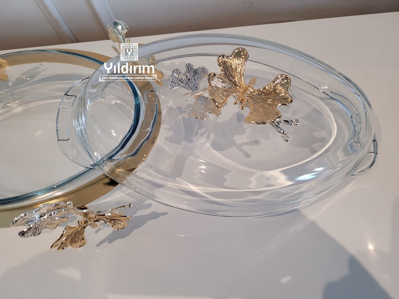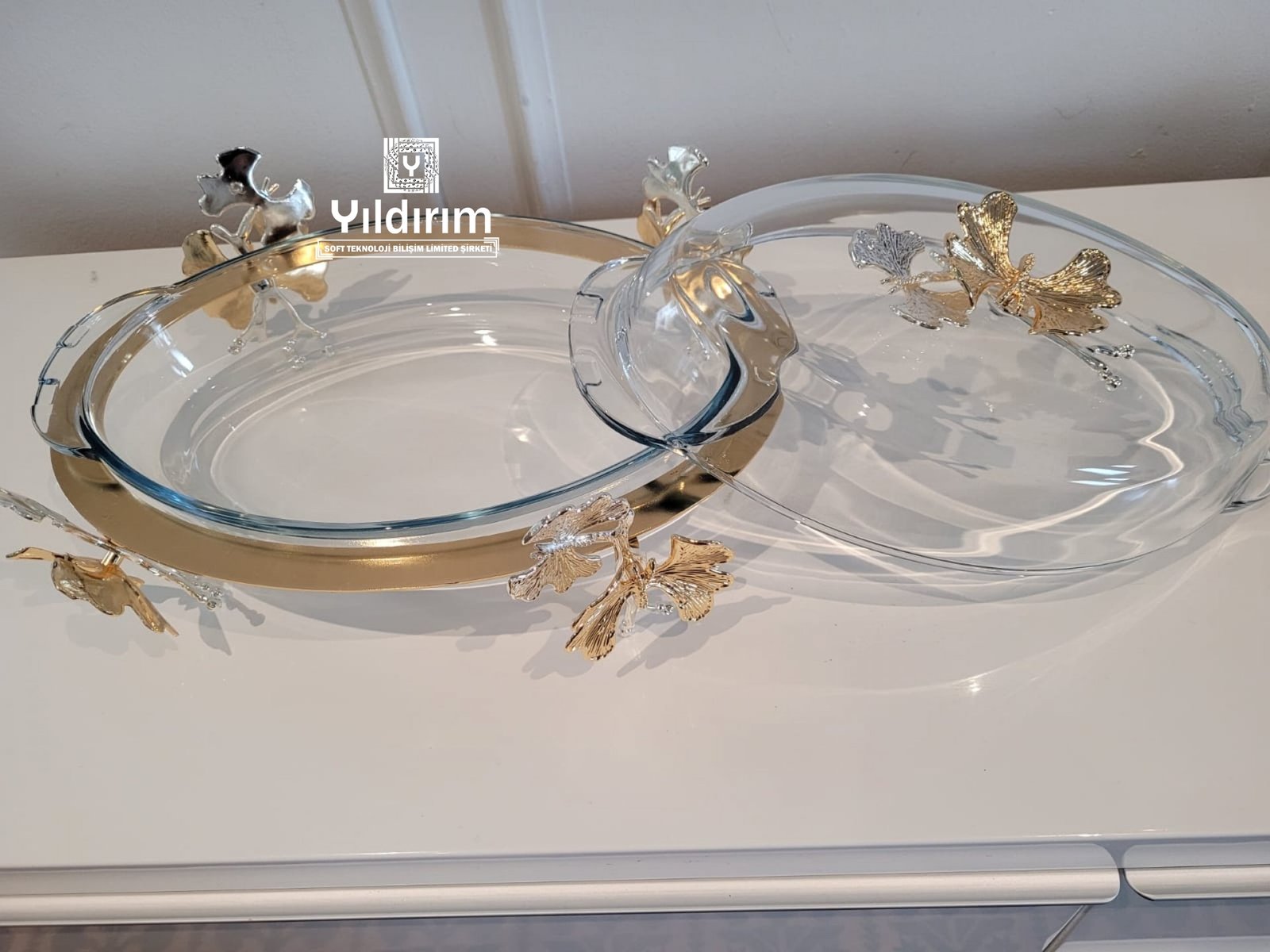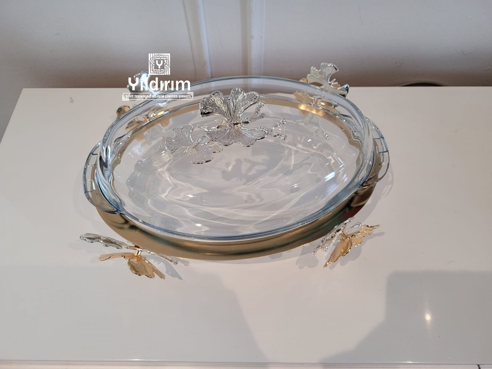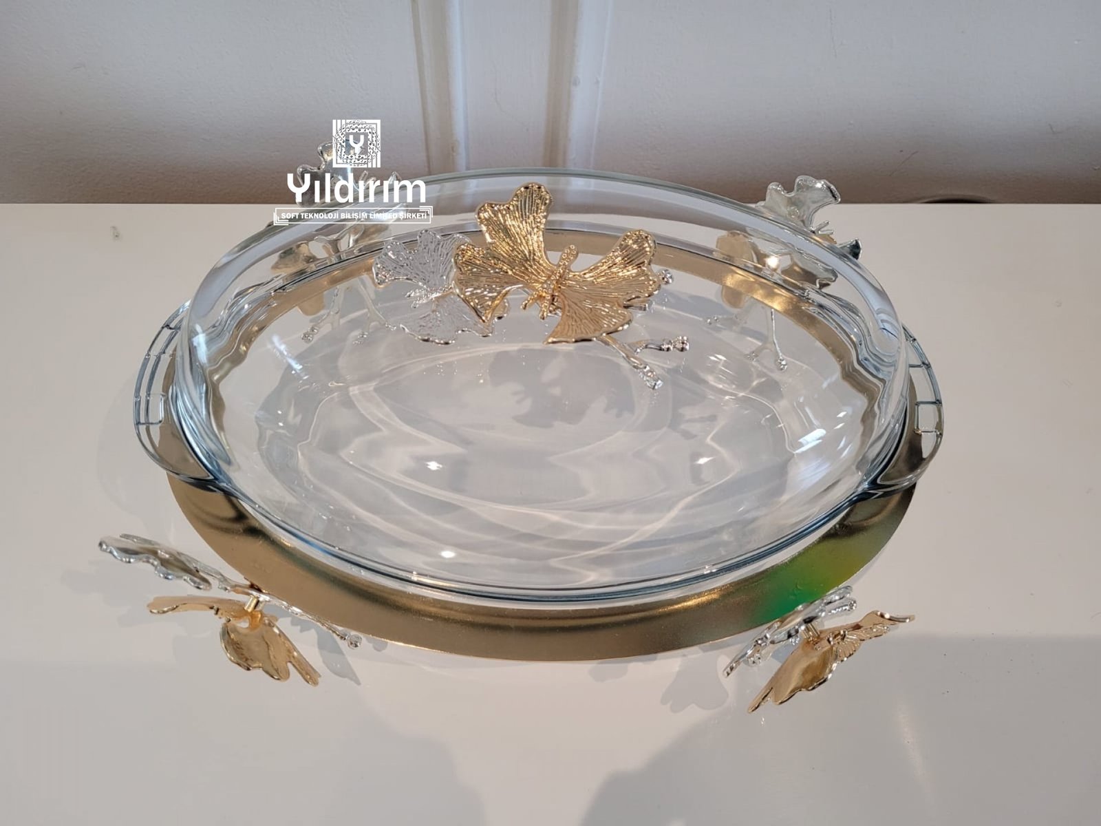 High end serving dish made of metal and glass