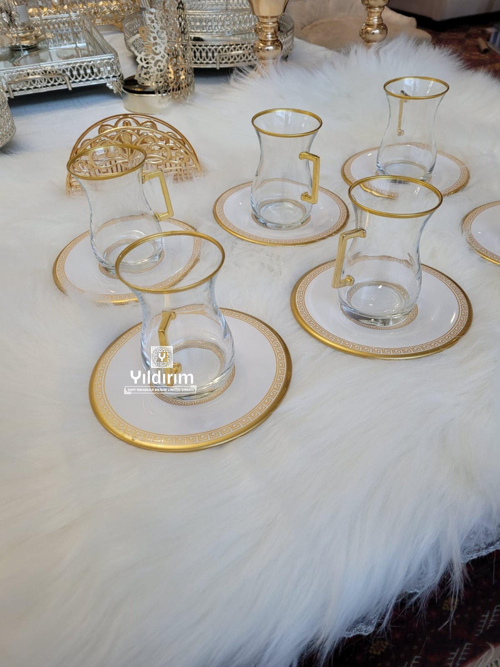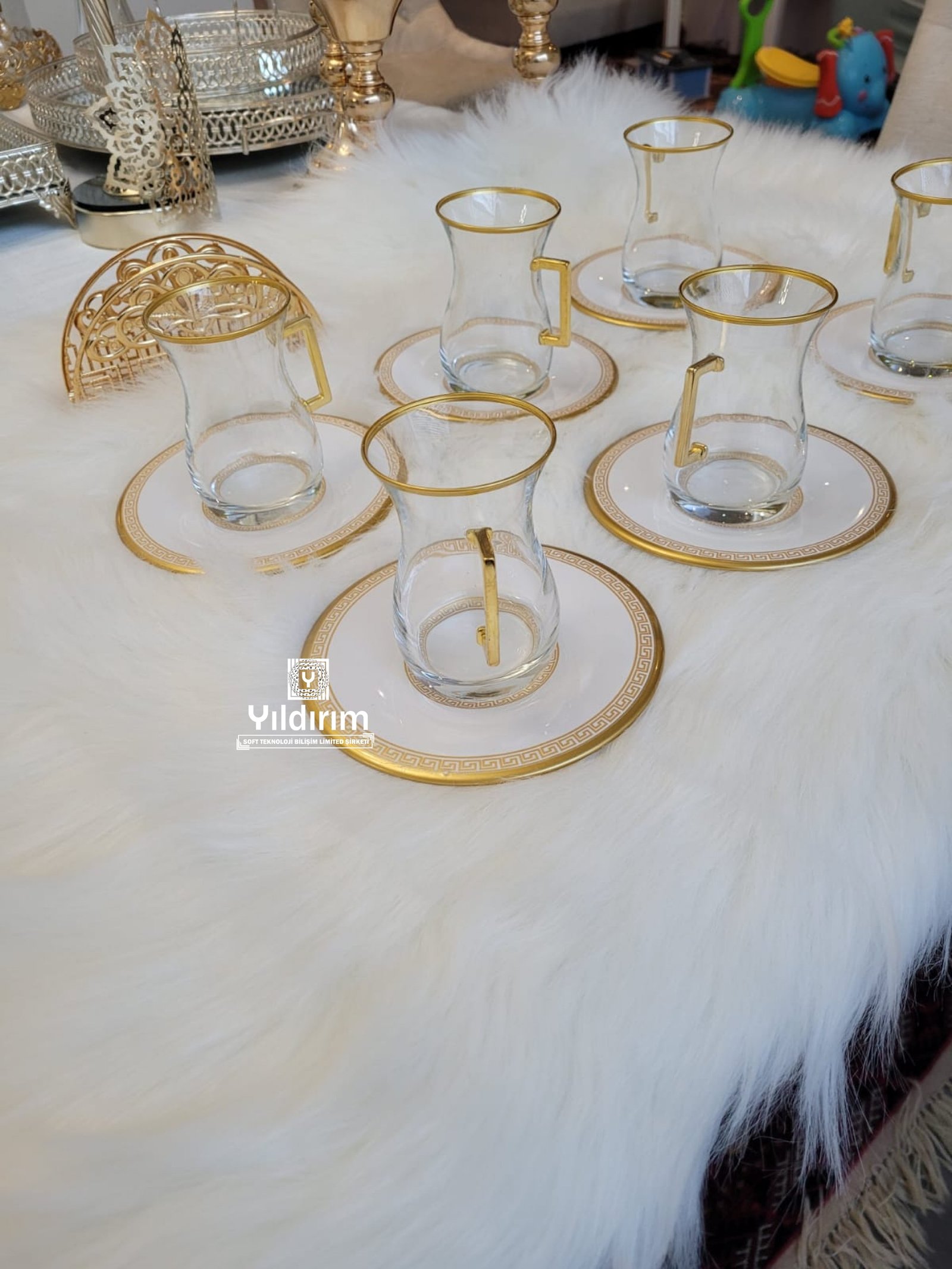 Tea set for six gold glass and metal